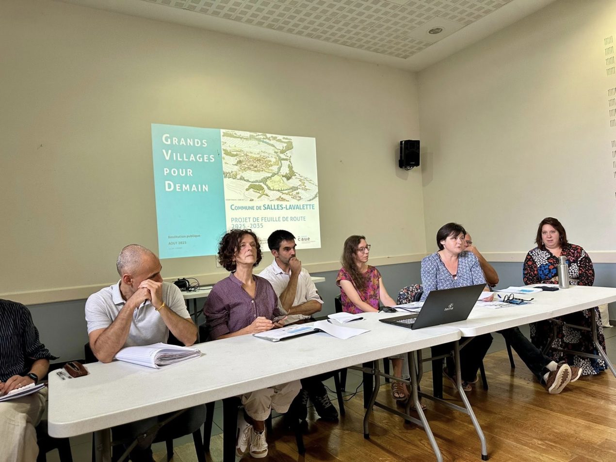 Invitée par la Mairie de SALLES LAVALETTE, réunion de restitution des travaux réalisés par les élus municipaux, le CAUE et les habitants de la commune, dans le cadre du dispositif Grands Villages pour Demain.